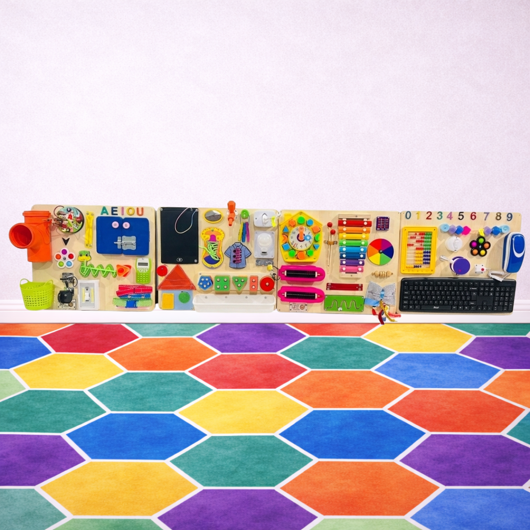 Com dimensões de 184x40cm, dividido em 4 módulos, este modelo transforma a parede em um verdadeiro espaço completo de exploração, aprendizado e desenvolvimento infantil.