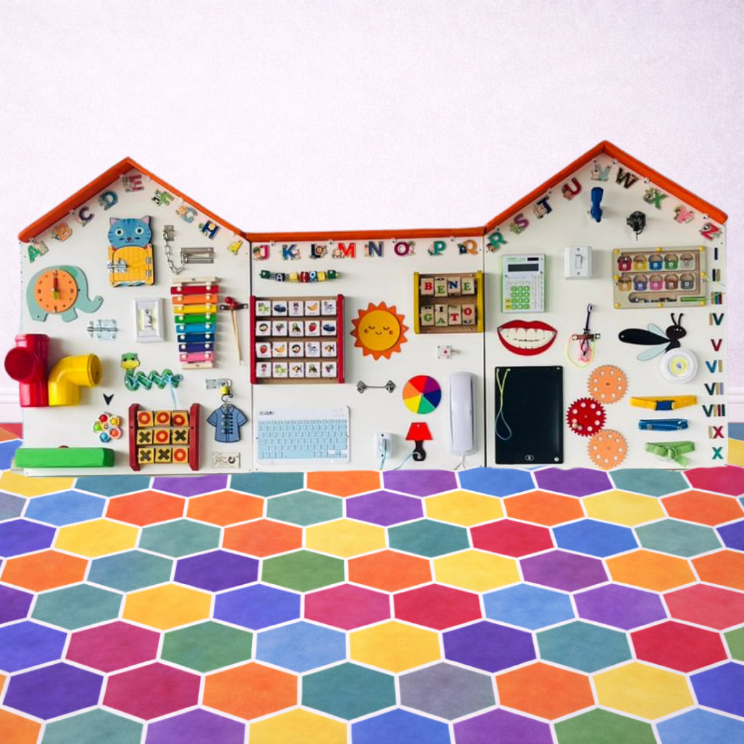 O Painel Sensorial Infantil Vila Sol é um recurso pedagógico completo, desenvolvido para estimular coordenação motora fina, alfabetização inicial, raciocínio lógico, percepção sensorial e autonomia infantil de forma estruturada, interativa e visualmente encantadora.