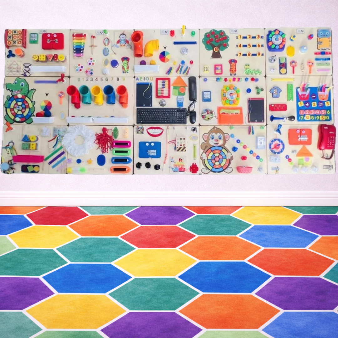 Com impressionantes 290x129cm, dividida em 15 módulos, esta parede sensorial transforma qualquer ambiente em um verdadeiro espaço interativo de desenvolvimento infantil.
