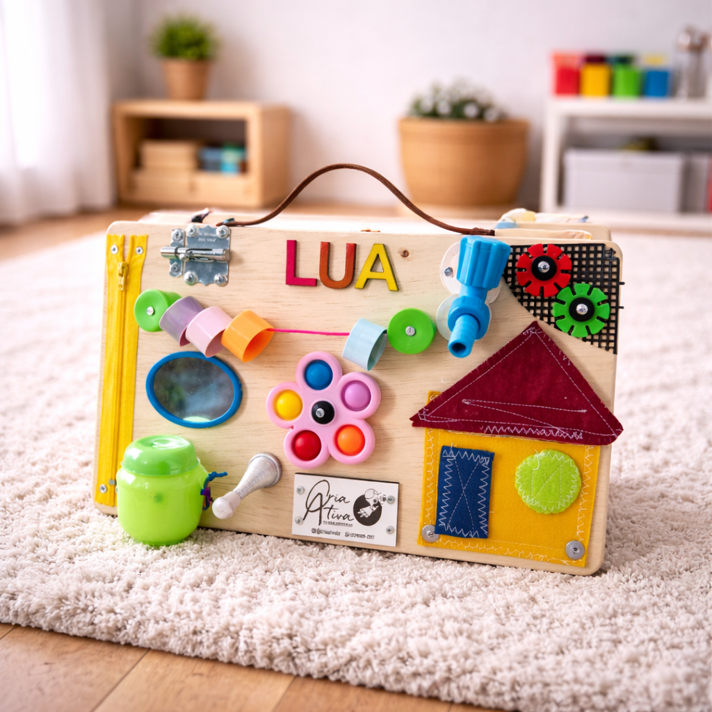O Painel Sensorial Portátil Natal foi desenvolvido para acompanhar a criança em todos os momentos do dia, oferecendo estímulo, autonomia e entretenimento inteligente mesmo fora de casa.