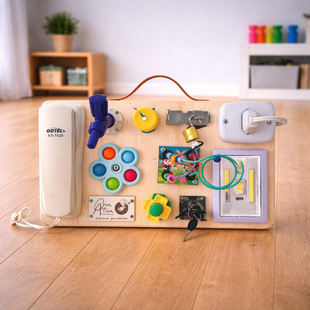 Com diversos elementos interativos do cotidiano, o painel desperta curiosidade, incentiva a autonomia e promove experiências sensoriais importantes para o desenvolvimento infantil.