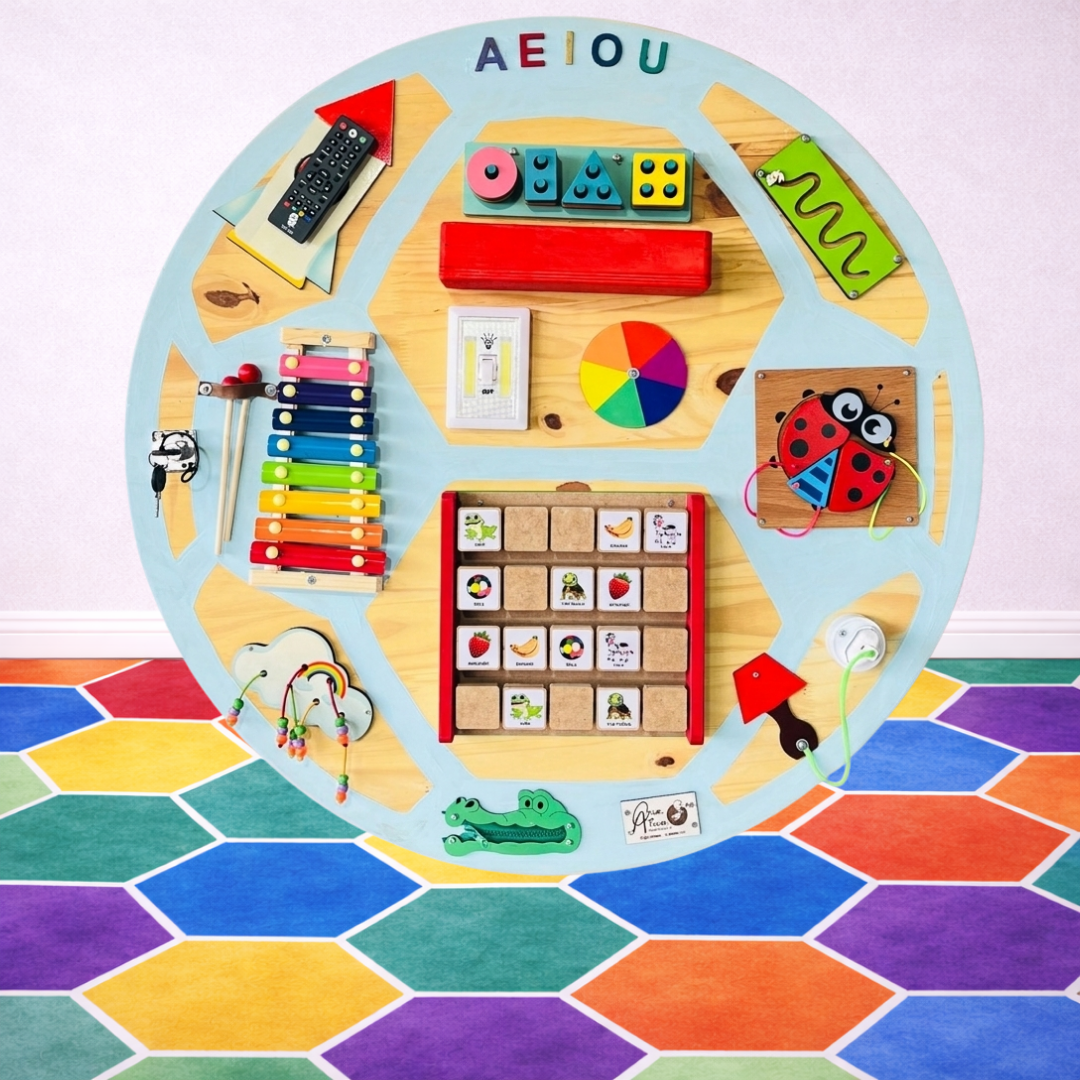 Seu formato circular transforma a parede em um espaço dinâmico de exploração, despertando a curiosidade natural da criança enquanto oferece diversas atividades sensoriais.